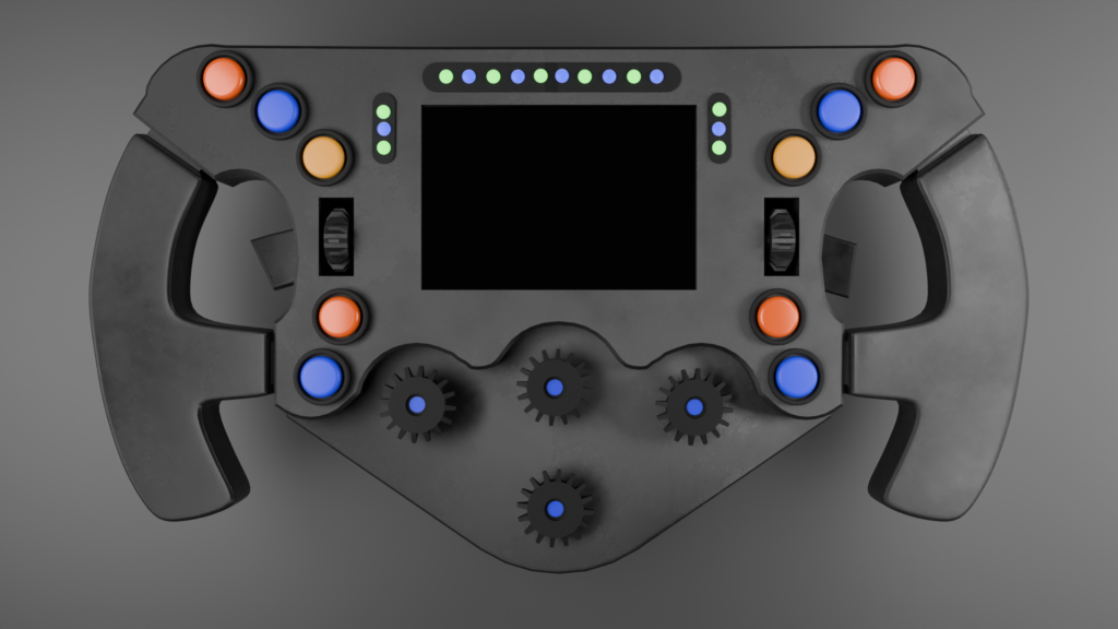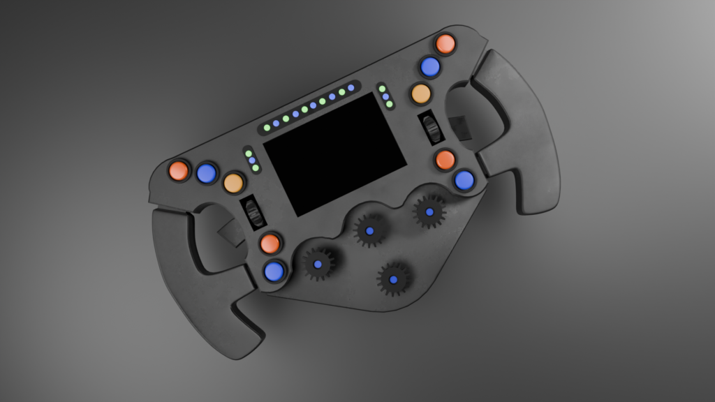 A highly detailed 3D model of a modern Formula 1 steering wheel, designed with realism and functionality in mind. The wheel features an ergonomic carbon-fiber body with sculpted grips, a central digital display, and an array of tactile controls including rotary dials, push buttons, and LED shift indicators along the top edge. Color-coded buttons and knobs enhance readability and usability, reflecting authentic F1 cockpit design. The materials emphasize a matte, slightly textured finish for the main body, contrasted with glossy buttons and illuminated elements. Ideal for racing simulations, close-up renders, or motorsport visualization, this model captures the complexity and precision of a real F1 steering wheel.
